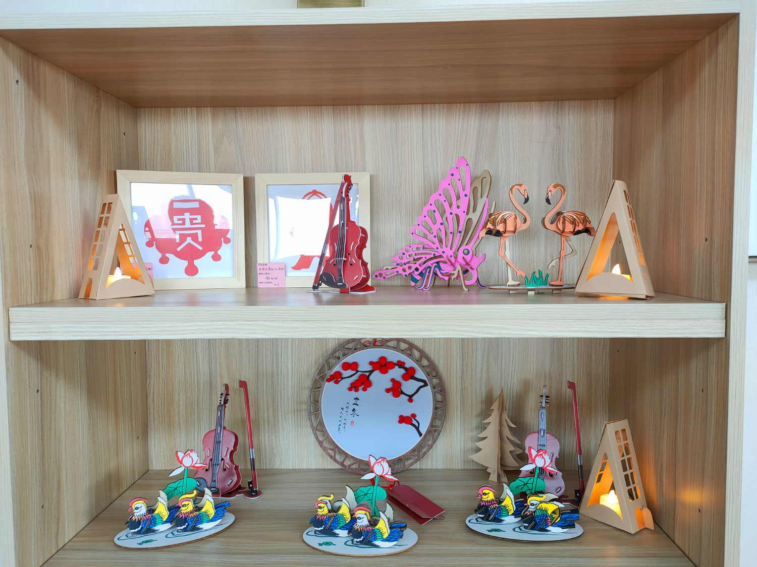 作品展览区中的展品全部出自在院长者之手,主要包括木板拼接画和中国风剪纸。吉祥喜庆的富贵锁、生动形象的火烈鸟、美丽精致的木质蝴蝶、精制机巧的纸制乐器,参与展示的作品严谨朴实、惟妙惟肖、色彩艳丽、生机盎然,展示了长者的聪明才智和高雅的艺术情操,传承和发展了天津宜善园“艺术、生活、家”的文化养老风格。