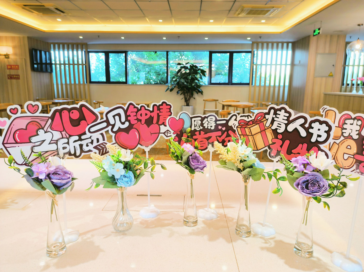 活动现场由各位工作人员提前准备了七夕节相关的各色装饰,并以多样花朵作为活动现场的浪漫点缀,“愿得一人心,白手不分离”等立牌更是营造出满满节日氛围感。